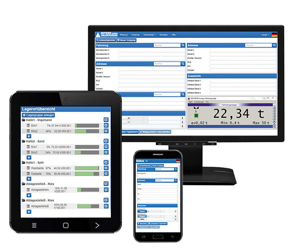 Lokale Client-Installationen auf dem Arbeitsplatz-PC entfallen, die Software wird über gängige Webbrowser aufgerufen. Dank responsive Design kann sie auch mit Tablet oder Smartphone bedient werden. Es ist lediglich eine WLAN-Verbindung nötig, und schon kann von überall auf dem Hofgelände zugegriffen werden. So ist auch die Auslösung von Wiegungen über das Handy möglich. Im Hintergrund läuft eine MS SQL-Datenbank, die hohe Datensicherheit und Verfügbarkeit garantieren soll.
