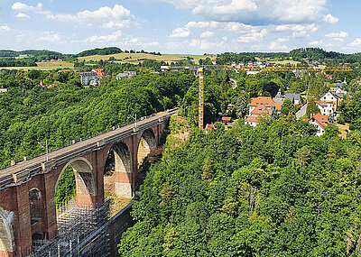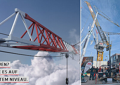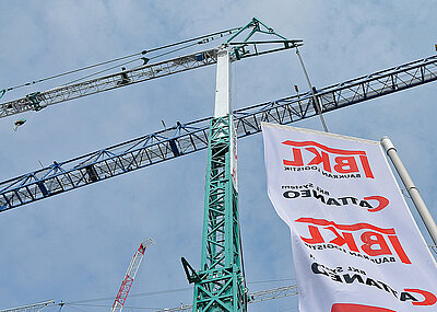 Die Baukranexperten griffen daher zu einer besonderen Kombination aus den über 500 Turmdrehkranen im BKL-Mietpark. Für das Verheben der bis zu 3 t schweren Fassaden- und Kaskadenteile kam ein 90 EC-B mit 40 m Hakenhöhe, 50 m Ausladung und 6 t maximaler Traglast direkt hinter dem Schloss zum Einsatz. Als zweiten Kran setzten die Kranspezialisten einen 32 TTR mit 24 m Hakenhöhe, 30 m Ausladung und 4 t maximaler Traglast ein. Der Untendreher ist dank seines Raupenfahrwerks geländegängig und konnte so in Hanglage montiert werden.