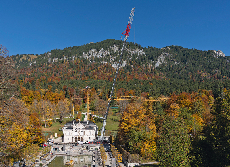Linderhof gilt als ein Lieblingsschloss des Bayerischen Königs Ludwig II. Es liegt umgeben von Parkanlagen in den bayerischen Alpen und zieht jährlich zahlreiche Besucher an. Das weitläufige bergige Gelände bot eine Herausforderung für das Krankonzept, denn die Hanglage schloss eine Standardbaukrangestellung nahezu aus.