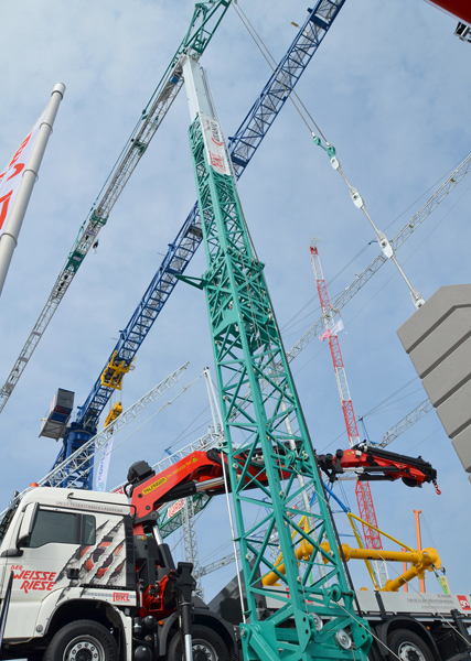 Premiere für 63-Metertonnen-Schnellmonmtagekran. Ganz neu ist der auf der Bauma 2019 vorgestellte Schnellmontagekran CM 415 mit Gitterkonstruktion. Ohne zusätzliche Kletterturmstücke zu benötigen, bietet der Untendreher drei Hakenhöhen von 23,8 Meter, 28,5 Meter und 31,5 Meter. Mit 20°-Ausleger-Steilstellung kann die maximale Hakenhöhe auf 42 Meter erhöht und an die Baustellensituation angepasst werden. Auch bei Last und Reichweite spielt der CM 415 in der 60-MetertonnenKlasse weit oben mit: Er erreicht 41 Meter Ausladung, eine Spitzenlast von 1,25 Tonnen und 5 Tonnen maximale Traglast. Dank der Leistungsdaten, dem Drehradius von nur 2,5 beziehungsweise 3,2 Metern und der einfachen Montage, bei der das zeitaufwändige Einklettern von Turmstücken entfällt, ist der Kran schnell aufgestellt und erleichtert die Baustellenplanung. Für den Transport stehen die bewährten Achsen R120 zur Verfügung.