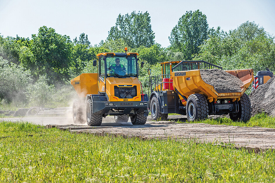 Mit dem Ziel der Optimierung der Transportwege und -zeiten bei Linienbaustellen wurden auf dem Gelände der Johann Bunte Bauunternehmung in Papenburg verschiedene Baustraßensysteme getestet. Dabei wurde eine Baustraße aus Holzbalken (Baggermatten) und Stahlplatten angelegt. Die Bergmann Dumper C810, C815 und C828 mit 9 t, 12 t und 25 t Nutzlast befuhren die Teststrecke wiederholt mit unterschiedlichen Geschwindigkeiten und Lasten. Hierbei sollte ermittelt werden, ob die von Bohnenkamp empfohlenen Reifen der Marke BKT der Situation gewachsen sind und die geforderten Leistungen bieten. »Alle Theorie ist grau. Nur Fahrversuche unter Praxisbedingungen zeichnen in Kombination mit unseren Berechnungen ein klares Bild und ermöglichen es uns, das wirtschaftlichste und sicherste Konzept für den Kunden zu erstellen. Auch die wichtigsten Umweltaspekte wie Bodendruck und Abgasemissionen fließen in die Bewertung ein«, so die Bohnenkamp-Reifenspezialisten Sven van Buer und Michael Fischer.