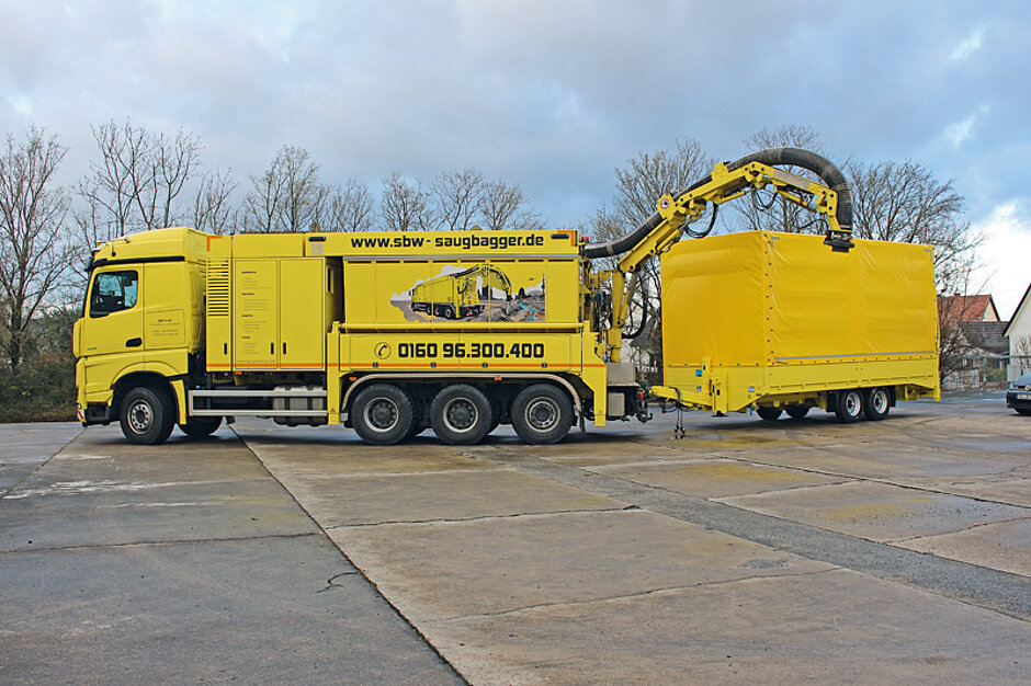 Je nach Baustellenlage müssen weitere großvolumige Schlauchverlängerungen, Saugzubehör und mitunter auch ein kleinerer Bagger mit zur Baustelle genommen werden. Mit der Zusatzausrüstung kann der Erdsauger dann auch in engen, hinter Häusern liegenden Bereichen eingesetzt werden, wo der Träger-Lkw selbst nicht hinkommt. Oder in der Gebäudesanierung, wo Schüttgut oder Bauschutt schnell abgesaugt werden soll.