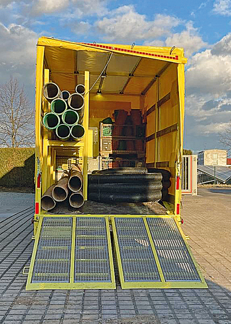 Unter dem Planenverdeckgestell befindet sich eine praktische Ausstattung und Aufteilung, die den Transport, sowie die optimale Nutzung und Ladungssicherung des benötigten Zubehörs für den 1-Mann-Anwender unterstützt. In einem H-Gestell mit Regalbrettern lassen sich die Schlauchverlängerungen und Rohre verstauen und ausziehen. Die senkrechten Gestellrohre sind für die einfache Verladung der Rohre als Führung konisch zulaufend.