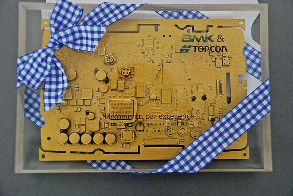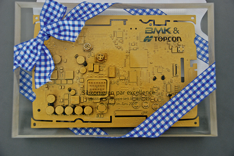 Inzwischen kommen bei BMK zwei selbstgebaute Silikonroboter zum Einsatz, die über 110 000 Baugruppen im Jahr silikonieren. BMK zählt zu den »Top 3«-Lieferanten von Topcon Electronics. Das Unternehmen (vormals Wachendorff Electronic) ist seit 2010 BMK-Kunde. Immer mehr Baugruppen wurden zu BMK verlagert, sodass BMK schon mehr als 230 000 Baugruppen an Topcon geliefert hat. t
