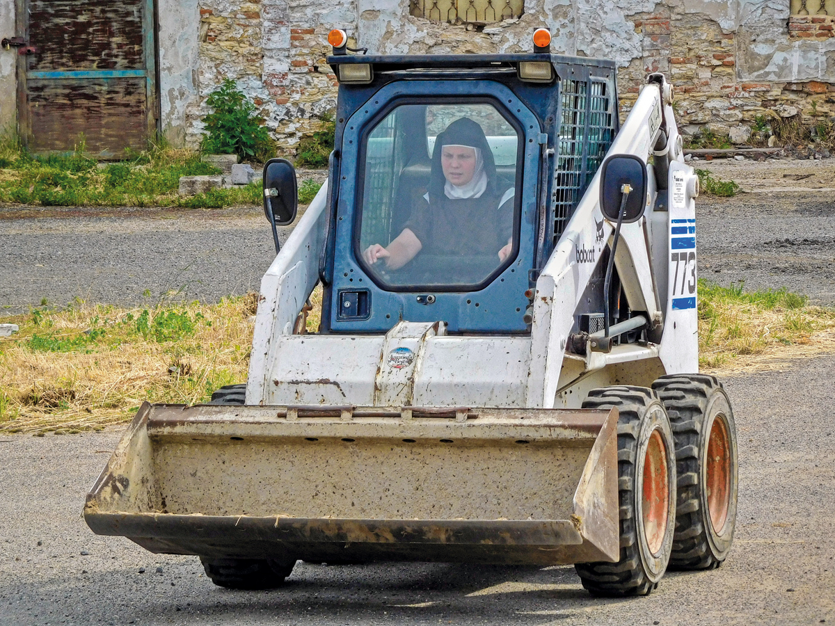 Da der Standort in Prag auf Dauer zu klein geworden war, sollte ein altes Landgut zum neuen Kloster St. Teresa von Avila umgebaut werden. Das Anwesen ist weitläufig, die Lage idyllisch inmitten der Natur. Eigentlich gute Voraussetzungen. Allerdings ging das Projekt mit einer großen Herausforderung einher: Der aus dem Jahr 1305 stammende Hof war buchstäblich in die Jahre gekommen. Mangels finanzieller Mittel nahmen die Schwestern viele Arbeiten selbst in die Hand. Sie lernten Radlader zu fahren und setzten sich kurzerhand selbst in die Maschinen. »Baumaschinen sind ja immer noch eher eine Männerdomäne und werden seltener von Frauen bedient – schon gar nicht von Ordensfrauen wie uns. Ich hätte auch nie gedacht, dass ich mal auf einem Radlader sitzen würde. Aber die Arbeit mit den Maschinen macht uns richtig Spaß«, erklärt Schwester Terezka.