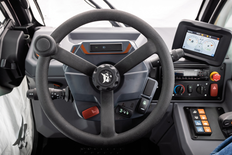 Für eine vereinfachte Steuerung und ein agileres Auftreten soll das neu konfigurierte Getriebesystem sorgen. Dessen verbesserte Laufruhe sorge für ein besonders präzises Arbeiten in der Höhe. Dazu trage laut Bobcat auch das »Boom Positioning«-System, ein weiterentwickelter Joystick sowie die verbessere Sicht aus der Kabine bei. Letztere ließ sich direkt während der Online-Vorstellung begutachten: In Dobříš stellten Bobcat-Mitarbeiter die umgestaltete Kabine sowie das komfortabel wirkende Innenleben vor – getrimmt auf die Bedürfnisse des Anwenders und gespickt mit zahlreichen Zusatzfunktionen wie der per Joystick ansteuerbaren Geschwindigkeitsmodi, dem neuen »Dynamic«-Modus oder dem optionalen Handgashebel mit »Flex Drive«-Funktion, was laut Hersteller eine drehzahlunabhängige Steuerung der Fahrgeschwindigkeit ermöglichen soll.