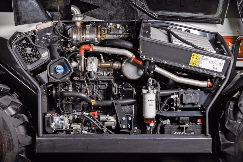 Unter der Haube findet sich bei den neuen Teleskopen eine aktualisierte Ausführung des Stufe-V-Motors D34 von Bobcat, der mit DPF-Nachbehandlung ausgestattet ist. Die Regeneration soll für den Bediener automatisch und störungsfrei ohne jegliche Leistungseinbußen erfolgen. Die 75-PS-Ausführung des Motors kommt ohne Adblue und die 100-PS-Variante ohne Abgasrückführung (EGR) aus. Laut Bobcat reduziert sich die Zahl der Wartungsintervalle für Stufe-V-Modelle von fünf auf drei, sodass die Wartung einfacher werden und weniger Betriebskosten anfallen sollen. Angebunden sind die Maschinen zudem an das neue Telematiksystem »Machine IQ«, was dem Anwender effiziente Nutzungsmöglichkeiten bieten soll.
