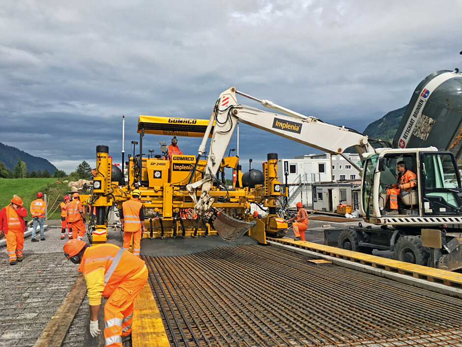 Die komplizierte Herstellung und Anlieferung des Baustoffs hinderte die Einbauleistung. Der Baustoff kam von einer bis zu 3 km entfernt aufgebauten und speziell konzipierten Betonmischanlage, die es auf eine Leistung von 14 m³/h bis18 m³/h brachte. Zwei bis drei Lkw haben zugeliefert, zumeist mit einem Ladevolumen von 2 m³. Der Beton wurde dann mit Bagger und Betonkübel in den Fertiger eingespeist, eingebaut wurde mit 3D-Steuerung.