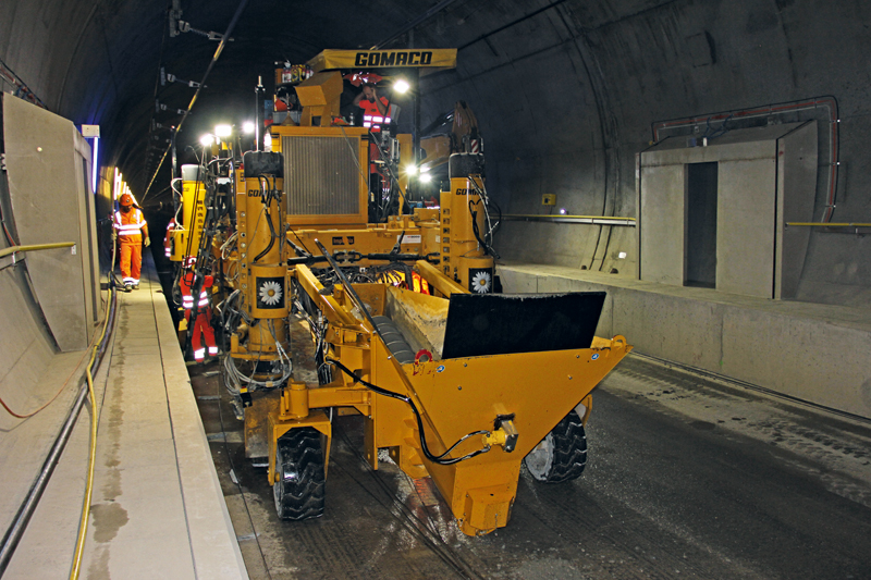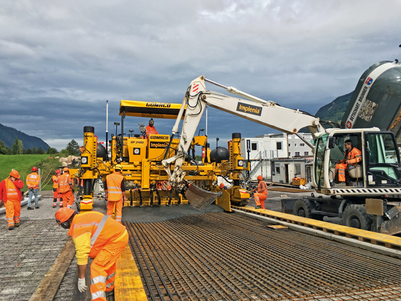 Implenia Schweiz gilt als führendes Bauunternehmen der Schweiz, arbeitet übergreifend in Deutschland, Österreich und anderen Ländern und beschäftigt europaweit mehr als 10 000 Mitarbeiter. Um in der Lage zu sein, Brückenprojekte mit UHFB erfolgreich auszuführen, benötigte Implenia eine mehrmonatige Testphase. Zunächst wurde der Baustoff entwickelt, dessen genaue Zusammensetzung geheim bleibt, dann eine spezielle Betonmischanlage. Ebenso wurde eine neue Bohle für den maschinellen Einbau mit dem Gleitschalungsfertiger GP 2400 von GOMACO entwickelt. Dieser kann Betondecken bis zu 7,32 m fertigen. »Der GP 2400 ist eine kompakte Maschine mit Möglichkeiten für verschiedene Bohleneinsätze sowie der Montage einer Heckbohle, die wir besonders in Tunneln für Betonfahrbahnen und Gleistragplatten einsetzen. Auch Gewicht und Kompatibilität passen zu unseren Anforderungen. Die Maschine ist flexibel und sehr geeignet für die Anwendungen bei den Projekten in der Schweiz«, betont Daniel Hardegger. Flexibel, weil Implenia mit nur drei verschiedenen Einbaubohlen eine große Anzahl möglicher Projekte abdeckt. Mit der extra entwickelten zero-clearance-Heckbohle hat Implenia erfolgreich ein großes Tunnelprojekt abgeschlossen. Die besondere Kombination aus Heckbohle und Fertiger ermöglichte es, dass Implenia 3,55 m breit fertigen konnte, ohne dass weiterer Platz am Rand benötigt wurde. Mit dem GOMACO-Fertiger und der UHFB-Bohle wurden insgesamt bereits 2 400 m³ UHFB auf Plätzen, in Wannen und Banketten, sowie in diversen Fertigteilen verbaut. Die Schichtdecken beliefen sich auf eine Höhe von 4 cm bis 12 cm.