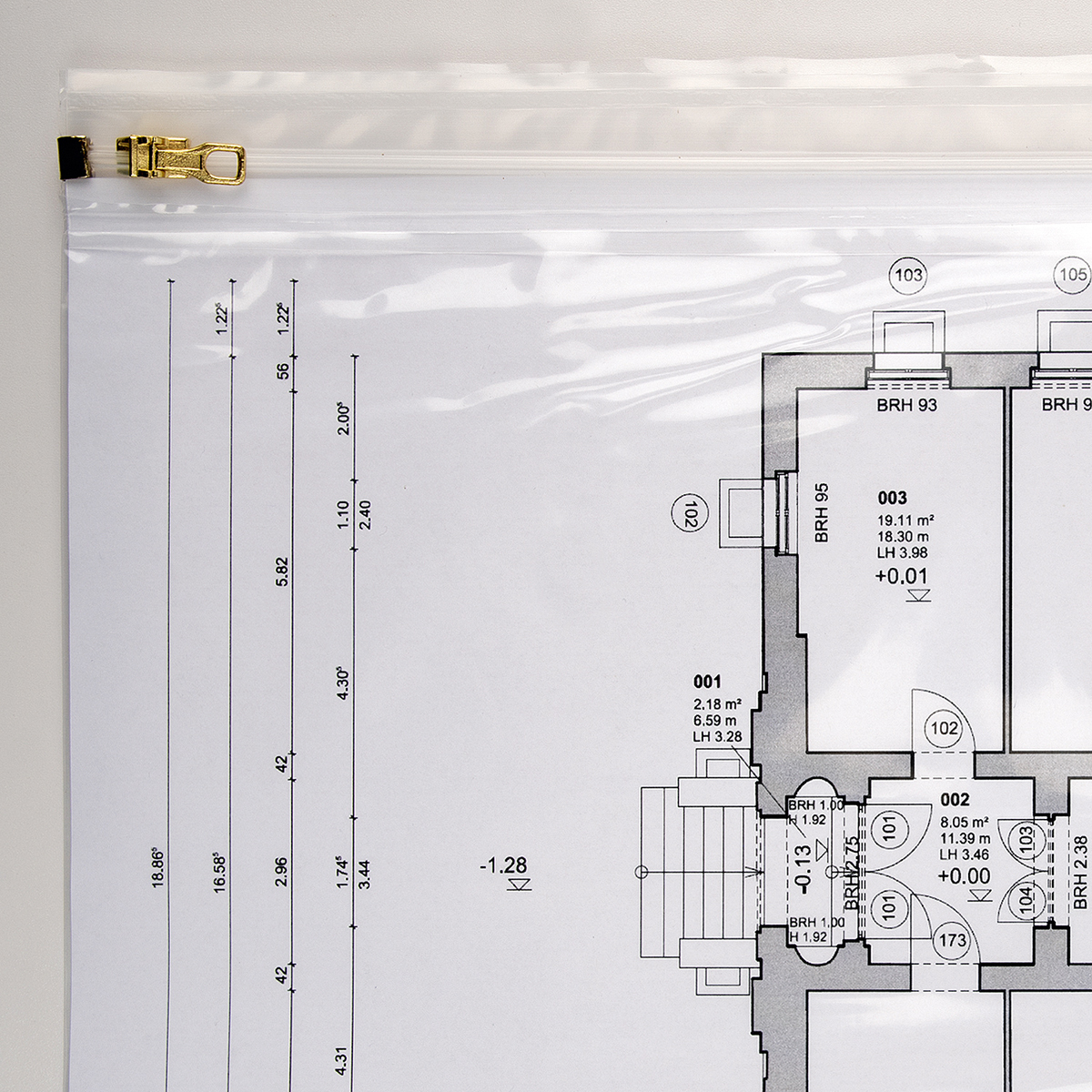 Für ein optimales Handling beim Einlegen der Dokumente sind die Planschutzhüllen etwas größer konzipiert als die typischen Planformate – so wird ein Einreißen oder Zerknittern des Bauplans vermieden.