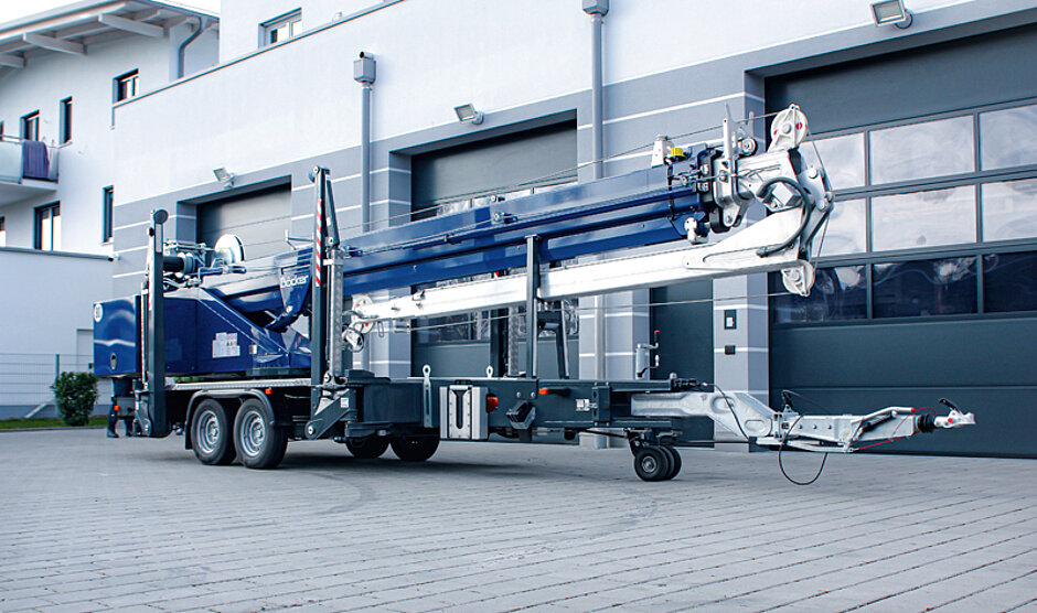 Zur Serienausstattung des Anhängerkrans zählen ein kraftvoller Rangierantrieb sowie eine Kransteuerung für größtmögliche Betriebssicherheit, gibt diese doch den maximalen Arbeitsbereich in Abhängigkeit von der Position der Stützen sowie der angehängten Last automatisch frei. Bei Einsätzen neben Stromleitungen erhöht die zuschaltbare Dreh- und Aufrichtwinkelbegrenzung zusätzlich die Sicherheit. Das variable Ausfahren jeder Stütze und die Autonivellierung ermöglichen den schnellen Aufbau des Anhängerkrans mit hoher Standsicherheit.