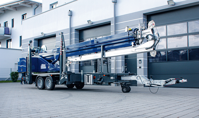 Der neue AHK 30 KS (Ausfahrlänge bis 30 m, Nutzlast bis 1,5 t) hebt selbst voll ausgefahren noch 250 kg. Die Bedienung erfolgt per Funkfernbedienung, der Kranführer hat dabei auf dem Farb-Display die aktuelle Betriebssituation im Blick. Der AHK 30 KS verfügt ebenso über ein Fernwartungsmodul, Fehlermeldungen können vom Böcker-Service eingesehen und beseitigt werden.