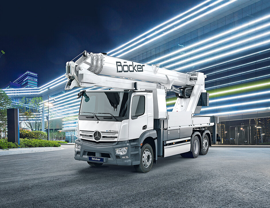 Es sollte der erste vollelektrische Autokran in Stahl-Aluminium-Bauweise sein, der in München für Aufsehen sorgte. Der neue Elektrokran AK 48e arbeitet nicht nur im Kran- und Bühnenbetrieb komplett elektrisch, aufgebaut auf einem Mercedes eActros fährt das 27 t schwere Modell auch ausschließlich batteriebetrieben zum Einsatzort. Mit dem AK 48e, so Böcker, solle eine neue Ära eingeläutet werden, die unter Beweis stelle, dass die Elektrifizierung kraftvoller Krantechnik und der Verzicht auf fossile Brennstoffe auf der Baustelle schon heute möglich seien. Bestehende und zukünftige Vorgaben hinsichtlich eines geräuscharmen, lokal emissionsfreien und klimaneutralen Antriebs mit regenerativer Energie erfüllt der AK 48e bereits.