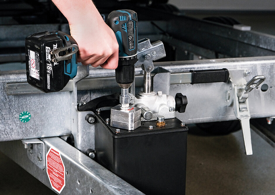 Der Hersteller aus Lastrup (Niedersachsen) hat sein bewährtes System optimiert und es noch kompakter gestaltet. Es ersetzt durch die Bedienung per Akkuschrauber die vorhandene Handpumpe und ist optional für viele Modelle der Kippanhängerfamilie erhältlich sowie laut Hersteller »spielend einfach« bei älteren Modellen der aktuellen Baureihe nachrüstbar. Neu ist, dass die Optimierung der Bauteile und deren Anordnung zu einem noch kompakteren System geführt hat. Darüber hinaus ist der bisher vorhandene Links- durch einen Rechtslauf ersetzt worden, der optimal mit dem Akkuschrauber zusammenarbeitet. Bei dem System handelt es sich um eine parallel geschaltete Zahnradpumpe, die mit einem Akkuschrauber und einem 17er-Steckschlüsseleinsatz bedient wird und die Kippvorgänge deutlich vereinfacht. Der Akkuschrauber sollte 18 V und 45 Nm Drehmoment aufweisen.t