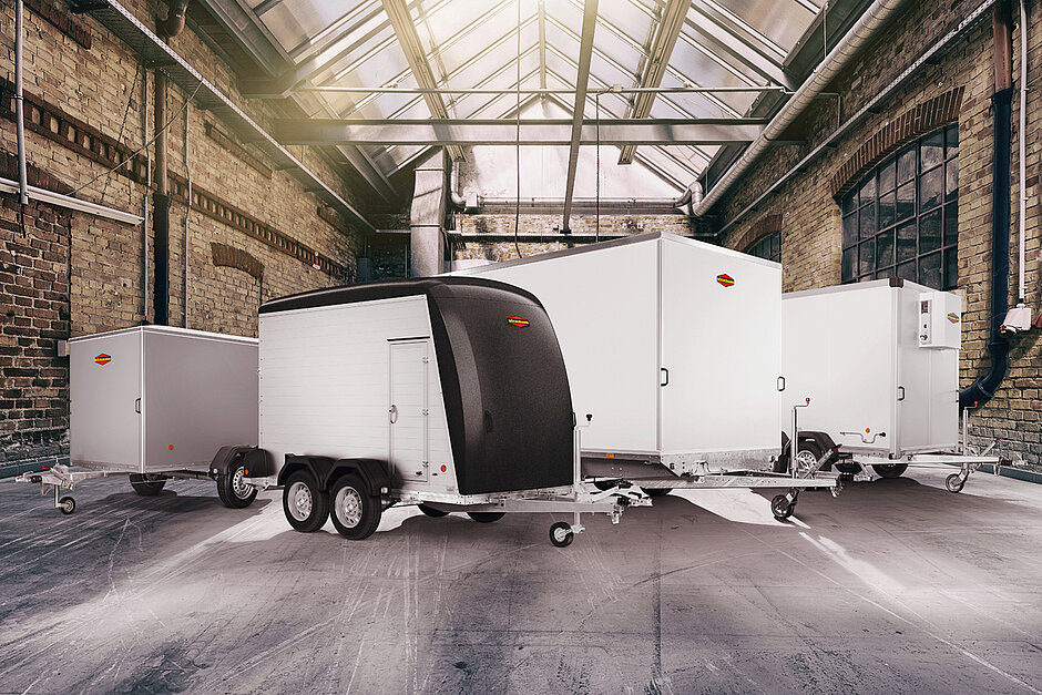 Das Kofferanhänger-Sortiment des Unternehmens ist umfangreich. Vom Koffer Tieflader, über den Koffer Hochlader bis zum Kühlanhänger gibt es die Modelle in unterschiedlichen Größen, Materialien und Ausstattungen. In puncto Ladehöhen gibt es bei vielen Modellen Tief- und Hochlader in zwei unterschiedlichen Ausführungen, die Standard-Varianten und die tiefergelegten F-Modell-Varianten.