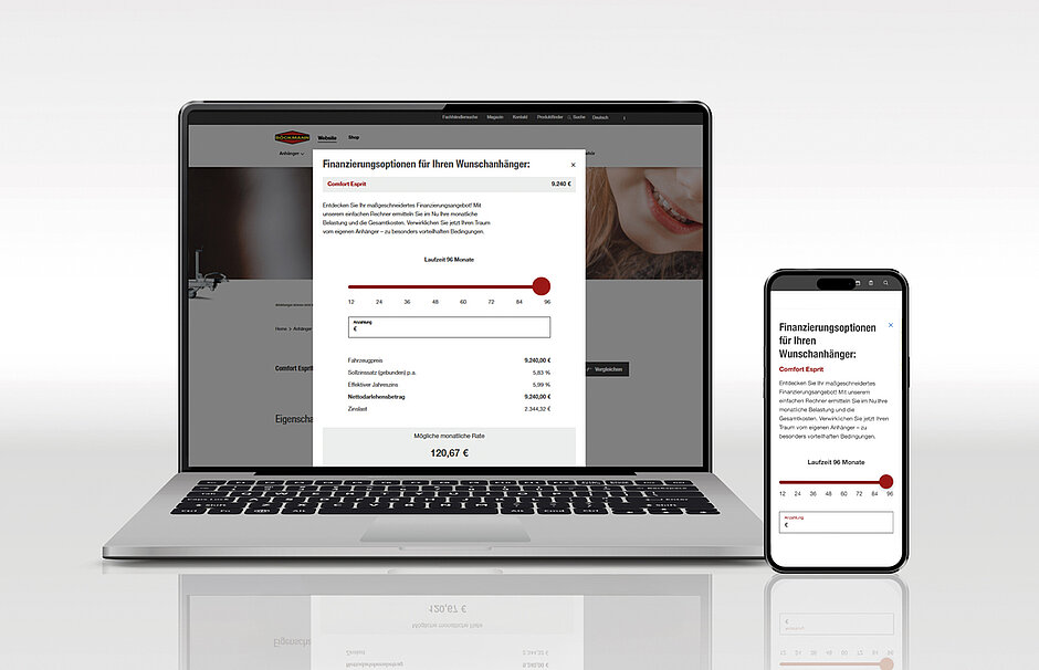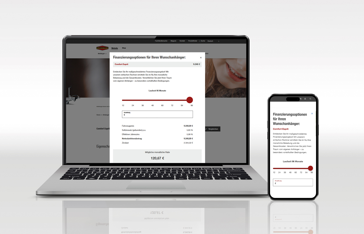 Ein besonderes Merkmal des Finanzierungsrechners ist die direkte Übermittlung der kalkulierten Finanzierung an einen Händler. Dies erleichtert eine kompetente Beratung und ermöglicht es dem Händler, bereits auf die Finanzierungswünsche des Kunden einzugehen und passende Angebote vorzuschlagen. Der Finanzierungsrechner ist für alle Pferde-, Vieh- und PKW-Anhänger von Böckmann verfügbar und trägt zu einem verbesserten Nutzererlebnis bei, indem er flexible Alternativen zum direkten Kauf bietet.