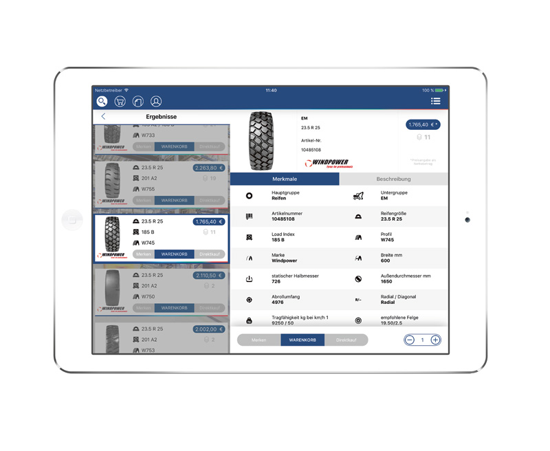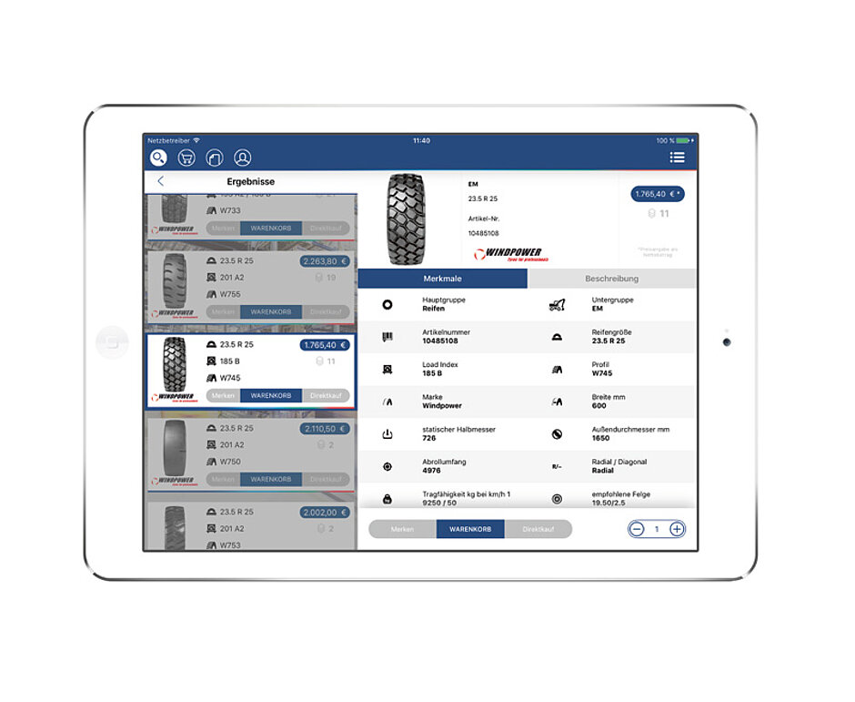 Die neue Shop-App für Smartphones und Tablets macht für Händler Bestellungen auch bei ihrem Kunden vor Ort möglich. Händler können damit direkt einen verbindlichen Preis nennen. Das Service-Werkzeug erlaubt den direkten Zugriff auf alle Preise, Daten und Mengen. Um die Handhabung der App möglichst benutzerfreundlich zu gestalten, wurden die Funktionen auf den Landmaschinen- und Reifenhandel angepasst. Die Anmeldung in der App ist per Fingerabdruck möglich: Einmal eingerichtet, kann sich der Nutzer statt mit Eingabe von Benutzername und Passwort, zeitsparend per Fingerabdruck anmelden. Zusätzlich kann der Nutzer alle Funktionen verwenden, auch wenn er keine Internetverbindung hat. Bestellungen werden bei fehlender Internetverbindung gespeichert und übermittelt, wenn das Gerät wieder online ist. Ein weiterer Pluspunkt ist die Reparaturfallbearbeitung. §