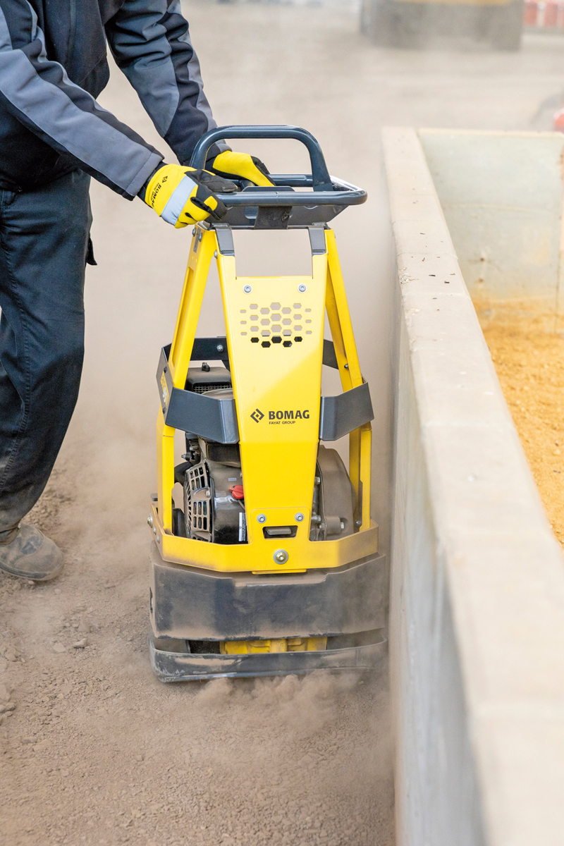 Mit der BR 95 hat Bomag im Vorjahr seine Light-Equipment-Produktpalette um eine kompakte vorwärtslaufende Rüttelplatte zum Verdichten von Kies, Sand und gemischtkörnigen Böden erweitert. Gerade bei Reparatur- und Ausbesserungsarbeiten im Erd- und Pflasterbau sollen sich die Vorzüge der viereckigen Grundplatte mit abgerundeten Ecken (450 mm) zeigen. Die wendige Maschine ist für Arbeiten in engen Bereichen geschaffen, da sie bis an die Kanten verdichten kann. Hohe Effizienz unterstützt die Arbeitsgeschwindigkeit von 30 m/min. Die Schütthöhe in einem Arbeitsgang liegt bei 25 cm je nach Material; dank der niedrigeren Amplitude im Vergleich zum Stampfer lässt sich die BR 95 mit ihrem Gewicht von 92 kg dabei nach Herstellerangaben besonders komfortabel und sicher führen.