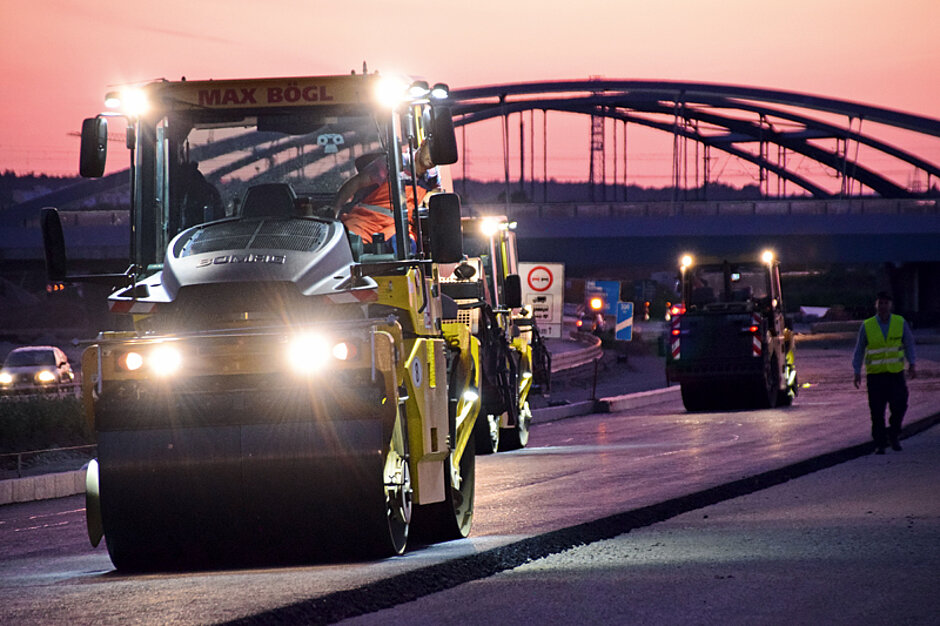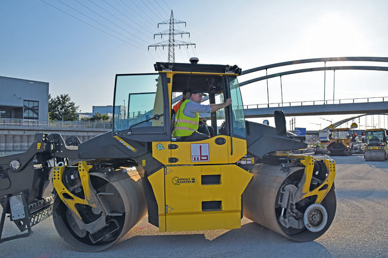 So setzt Max Bögl seit geraumer Zeit auf die Präzisionsmaschinen von Bomag, unter anderem auf die schemelgelenkten Tandemwalzen in Kombination mit dem Asphalt Manager. Die älteste Tandemwalze, die bei diesem Infrastrukturbauprojekt im Einsatz ist, ist die 174 AP AM aus dem Jahr 2007. Auch diese Tandemwalze mit geteilten Bandagen aus dem Bestand von Max Bögl ist bereits mit dem bewährten Asphalt Manager, der drei Erregersysteme inklusive der Oszillation zur Auswahl bietet, ausgestattet.