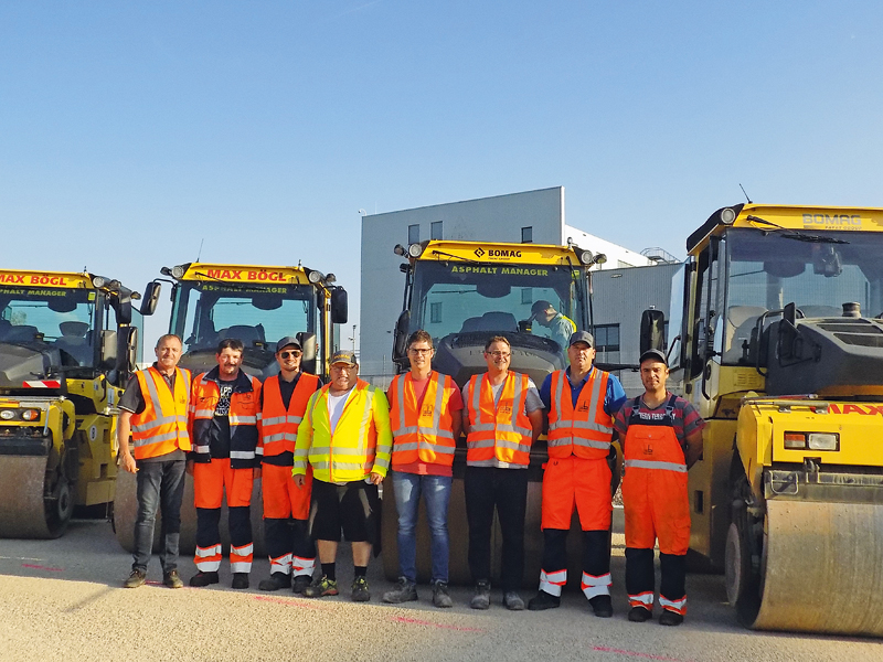 Um den eigenen Qualitätsanspruch und die Effizienz weiter zu steigern und gleichzeitig Ressourcen zu schonen, testet Max Bögl bei dem Bauprojekt zwei Innovationen, die Bomag auf der letztjährigen Bauma vorgestellt hat. Max Bögl, langjähriger Stammkunde von Bomag, setzt schon jetzt zu 80 % auf das Equipment der Fayat-Marke und testet zum einen die BW 174 AP Hybrid mit Asphalt Manager und die BOMAP.