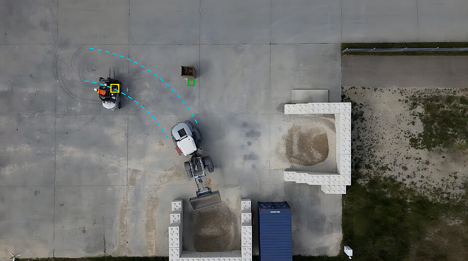 Da die Datenmenge allein für eine State-of-the-Art-Erkennung nicht ausreicht, enthält die »CAS«-Software von Bosch Rexroth einen leistungsfähigen Algorithmus, der für jede Fahrsituation die relevanten Objekte herausfiltert, um Falsch-Positiv-Meldungen auf ein Minimum zu begrenzen. Dies liegt zum einen an der gezielten Überwachung der relevanten Gefahrenbereiche und zum anderen an der präzisen Vorhersage der Fahrzeugbewegungen. Setzt etwa ein Radlader mit eingeschlagenem Lenkrad zurück, führen nur Objekte innerhalb des gebogenen Fahrkorridors zu Warnungen oder Verzögerungen.