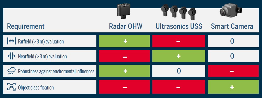 Um bei höheren Geschwindigkeiten rechtzeitig eine Verzögerung einleiten zu können, ist eine radarbasierte Überwachung des Fahrwegs unverzichtbar. Für eine zuverlässige Klassifizierung des Gefahrenpotenzials berücksichtigt das »CAS« von Bosch Rexroth auch die Differenzgeschwindigkeit zwischen Maschine und sich bewegenden Objekten. Für das Nahfeld unter 3 m Distanz ist Ultraschall besonders effektiv und wirtschaftlich. Eine ergänzende Personenkennung gelingt mithilfe intelligenter Kameras. Für eine möglichst hohe front- und rückseitige Erkennungsquote bei unterschiedlichen Maschinen kann das »CAS« die Umgebung zeitgleich mit bis zu zwei Radar-, 12 Ultraschall-Sensoren und zwei Smart Cameras erfassen.