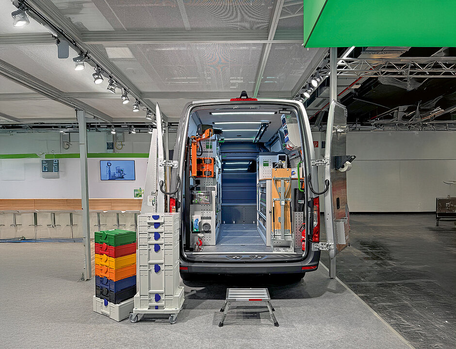 Der Laderaum des Fahrzeugs ist mit einem Drehkran am Heck, einer ausklappbaren Werkbank samt Schraubstock und stabilisierendem Standfuß sowie einer autarken Strom- und Druckluftversorgung ausgestattet. Die gezeigte Lösung verdeutlicht, wie individuell die Fahrzeugausbauten konfiguriert werden können – ganz nach Bedarf und Einsatzzweck. Ein weiteres umfassendes Ausbaubeispiel wird auf dem Stand A 411 der Südstern - Bölle AG + Co. KG in der »dm-arena« zur Schau gestellt.