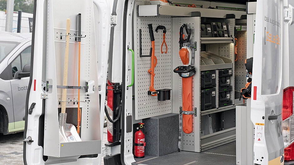 Bis zu 12 Akkus des Stihl AP-Systems lassen sich darüber hinaus über eine elektrische Außeneinspeisung mit nur einem Kabel sicher im Fahrzeug laden. Die dafür vorgesehenen Ladegeräte sind in den Regalmodulen installiert. Für den auslaufsicheren Transport flüssiger Betriebsstoffe ist eine Gebindewanne vorgesehen. Motorisierte Werkzeuge wie Sägen und Hochentaster kommen verzurrt in Schubladen und Langgutwannen unter. Auf einige der Systainer 3 Servicekoffer und Schubfächer haben Anwender bei geöffneter Seitentür bequemen Zugriff, ohne den Laderaum überhaupt betreten zu müssen.