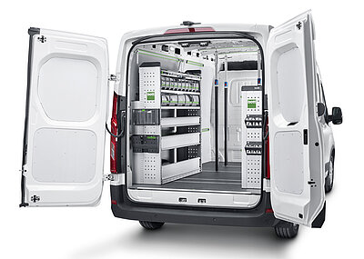 Beide Fahrzeuge sind für den vielseitigen Einsatz im Bauhandwerk konzipiert. Innenbeleuchtung und eine 230-Volt-Versorgung bilden die Basis für einen professionellen mobilen Arbeitsplatz. Die Fahrzeuge sind mit ausklappbaren Schraubstöcken im Heckbereich ausgestattet. Da der Laderaum des Großraumtransporters die Arbeit im Stehen erlaubt, ist hier außerdem ein stabiler Werktisch installiert. An der Fahrzeugwand befestigte Halterungen und Behälter gewährleisten einen schnellen Zugriff auf die am Tisch benötigte Ausrüstung. Mit Schubladen ausgestattete Sitzbänke und in der Einrichtung versenkbare Schreibplatten erlauben in beiden Fahrzeugen wettergeschützte Büroarbeit.