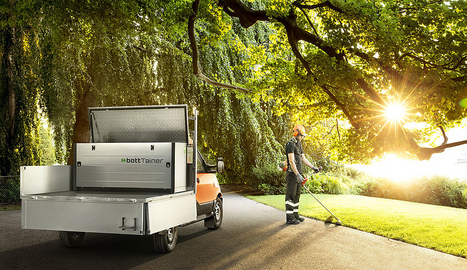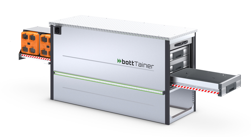 Doch der bottTainer ist weit mehr als nur ein Element für das Organisieren und Sichern der Ladung. bott bietet eine einzigartige neue Lösung an, um darin gesammelt die Akkus für Maschinen zu laden. Gemeinsam mit STIHL entwickelte bott neue Elemente für den bottTainer, in denen Ladegeräte für STIHL-Akkus integriert sind. Die Unterbringung der Ladegeräte auf einem Auszug erleichtert den ergonomischen Zugriff von außen. Den bottTainer mit integriertem Lademanagement gibt es in drei Ausführungen für 8, 16 oder 28 Akkus.