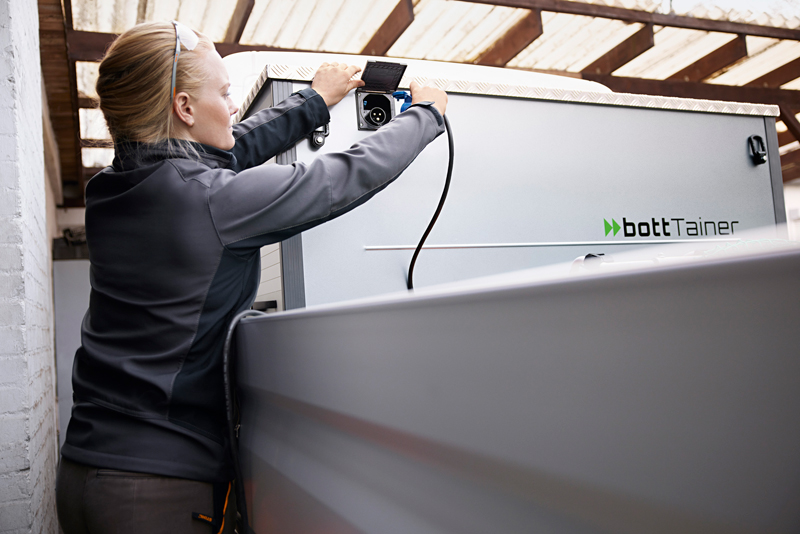 Die Akkus für die Maschinen werden im bottTainer sicher, sauber und trocken aufbewahrt. Nach der Arbeit werden die Ladegeräte über eine Außeneinspeisung zentral mit Strom versorgt. Das Lademanagement sorgt dafür, dass alle Akkus sicher auf einmal aufgeladen werden, ohne jedes einzelne Ladegerät mühsam separat an einer eigenen Steckdose anschließen zu müssen. Eine Schutzleiterüberwachung (PRCD-S) gewährleistet die notwendige Sicherheit, sodass sich das Gehäuse des bottTainer bei einer defekten Leitung oder Verbindung nicht mit Strom aufladen kann. So werden sämtliche für die tägliche Arbeit benötigten Akkus stets gleichzeitig – und vor allem auch sicher – aufgeladen und sind am nächsten Tag wieder einsatzbereit.