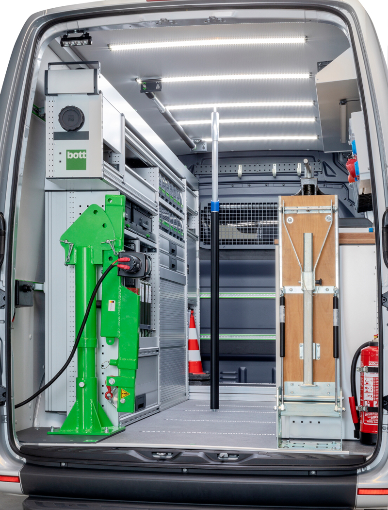 Mit den cleveren Systemmaßen bietet die bott vario3 Fahrzeugeinrichtung einen großen variablen Spielraum bei der Konfiguration. Auf diese Weise lässt sich das Equipment optimal ordnen und sicher verstauen. Zusatzkomponenten, wie einen Kranaufbau oder die Stromversorgung mit einem praktischen Unterflurgenerator, ergänzen die Fahrzeugeinrichtung mit allem, was beim autarken Einsatz auf der Baustelle notwendig ist.