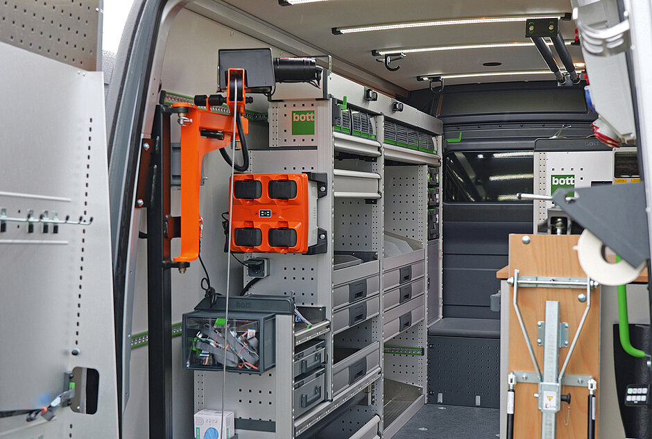 Die Fahrzeugeinrichtungsmodule sind Teil des an verschiedene Kundenbedürfnisse anpassbaren »bott vario3«-Systems. Dieses lässt sich nicht nur den Platzverhältnissen des Fahrzeugs angleichen – auch die Elemente zur Ladungssicherung können frei gewählt und positioniert werden. Hierzu zählen beispielsweise unterschiedlich dimensionierbare Schubladen, auslaufsichere Gebindewannen sowie Halter für Koffer und Sichtlagerkästen. An einem der Seitenteile der Einrichtung sind Ladeplätze für Akkus des »Stihl AP«-Systems angebracht. Unter anderem hier findet sich außerdem das »perfo«-Lochraster: Das charakteristische Stanzmuster mit quadratischen Löchern setzt Bott auch für die stationären Betriebs- und Arbeitsplatz einrichtungen ein. Entsprechend groß ist die Auswahl verfügbarer Haken, Halter und Behälter, die mit wenigen Handgriffen sicher daran befestigt werden können.