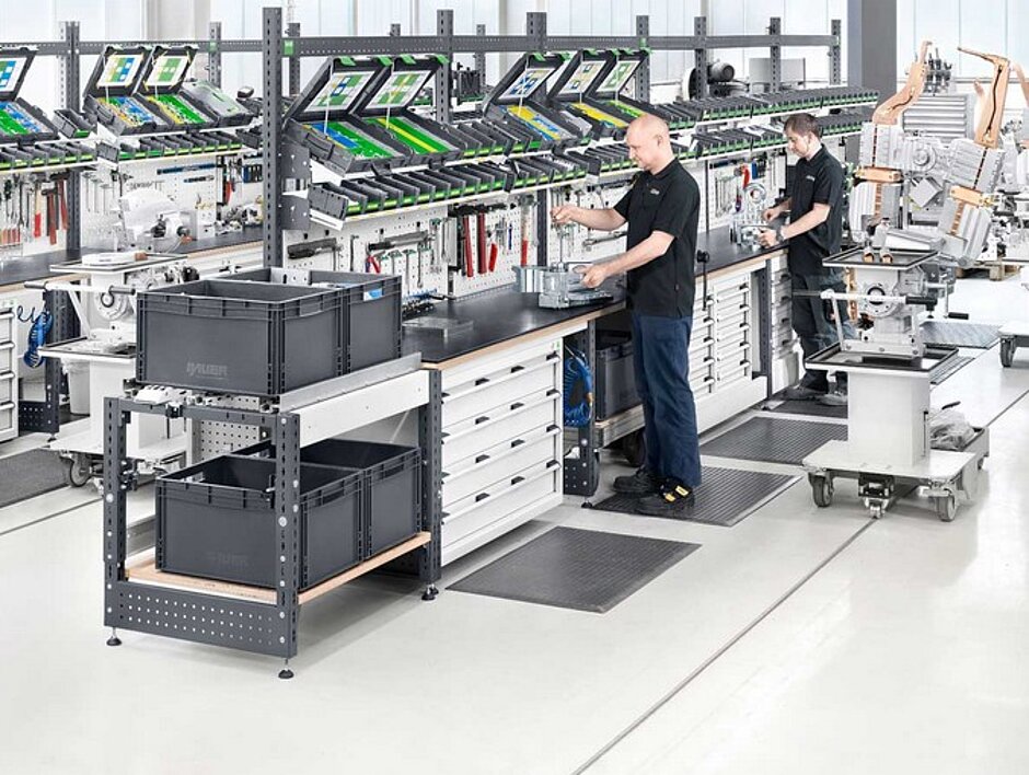 An einem avero Montagearbeitsplatz bildet bott beispielhaft einen Prozess einer Serviceabteilung eines Elektrowerkzeugherstellers ab. Im „Repair-Center Powertools“ werden Reparaturen an Elektrowerkzeugen simuliert. Die reparierten Powertools werden danach in Ihrem zugehörigen Systainer³ zum Versandprozess befördert.