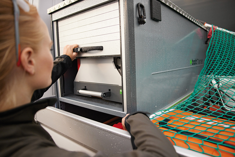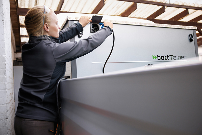 Die verschiedenen Varianten der Neuheit sollen sich besonders für GaLaBau-Betriebe oder kommunale Dienste anbieten. In Zusammenarbeit mit Stihl hat bott darin Ladegeräte für Akkus integriert. Die Ladegeräte sind auf Auszügen befestigt, sodass man ergonomisch günstig auf die Akkus zugreifen kann. Der »bottTainer powered by Stihl« mit Lade-Management ist mit Ladegeräten für 8, 16 oder 28 Akkus erhältlich.