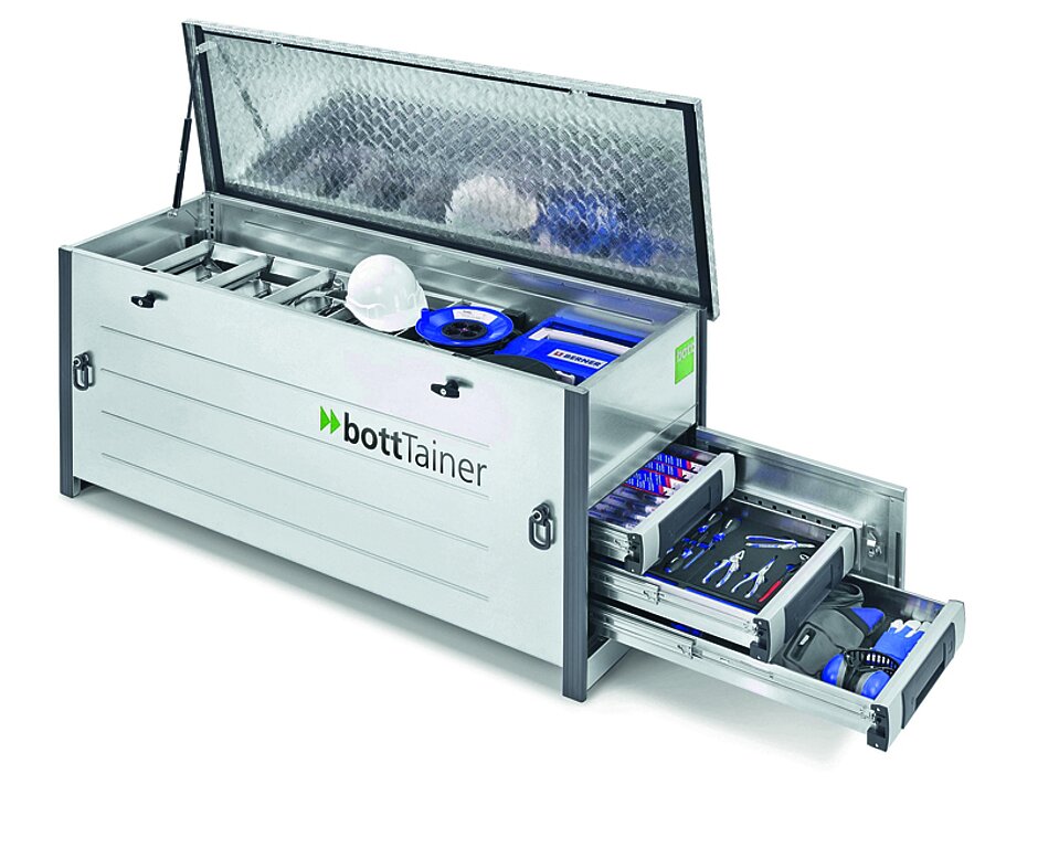 Für die Ladungssicherung und den Schutz vor Diebstahl auf Pritschen- und Pick-Up-Fahrzeugen entwickelte Bott den »bottTainer«, der Werkzeug und Material auf offener Ladefläche organisiert. Seine robuste Rahmenkonstruktion verleiht ihm eine hohe Stabilität. Die Seitenteile und der Boden des »bottTainer« sind aus verzinktem Stahlblech gefertigt, die Kanten verstärkt. Zahlreiche Möglichkeiten zum Aufteilen des Stauraums mit Schubladen, »bottBoxen« oder Koffersystemen machen den »bottTainer« zu einem Multitalent. Bott bietet für die Ladungssicherung auf Pritschen weitere Hilfsmittel an. So sichert Ladungssicherungsgewebe loses Transportgut auf der offenen Ladefläche, wie beispielsweise feinen Sand oder Grünabfälle. m