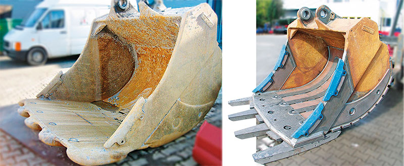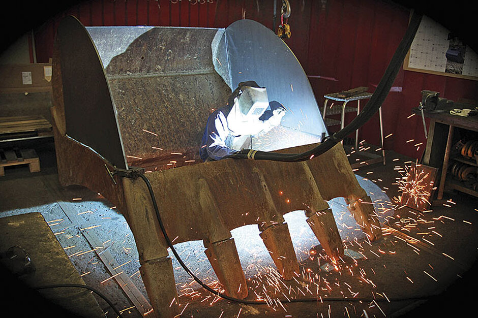 Löffel, Anbaugeräte und Schnellwechsler unterliegen einem natürlichen Verschleiß. Die Servicewerkstatt von Lehnhoff Hartstahl hat sich auf die Reparatur der gebrauchten Arbeitshelfer – egal welcher Marke – spezialisiert. Bis zu 200 Anbaugeräte bringen die Spezialisten pro Saison auf Vordermann: Tieflöffel, Grabenräumlöffel, Ladeschaufeln, Greifer, bis hin zu Baumscheren und Schnellwechslern. Die Vorgehensweise ist dabei klar definiert. »Bevor wir das erste Mal Hand anlegen, wird jedes Teil von uns geprüft«, erklärt Serviceleiter Heiko Müller. »Jeder Bagger hat seine Eigenheiten, jeder Einsatzbereich andere Belastungen, jeder Fahrzeugführer sozusagen seine eigene Handschrift. Genau solche Details führen zu Schadensmustern am Werkzeug, die so einzigartig sind wie ein Fingerabdruck. Die daraus gewonnenen Erkenntnisse nutzen wir, um die entscheidenden Stellen besonders zu verstärken.«Beim Löffel sind vor allem die Zähne, Messer und der Boden hohen abrasiven Kräften ausgesetzt. Durch die Verarbeitung hochwertiger Hartstähle bis 500 HB und hohe Bruchsicherheit durch entsprechende Zähigkeit und konstruktive Versteifungen ist der Verschleiß bei den Lehnhoff-Produkten von Haus aus sehr gering. Trotzdem frisst der Zahn der Zeit auch an hochwertig verarbeiteten Produkten.