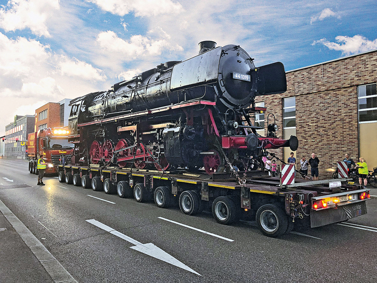 Schwerlastspediteur Hermann Paule aus Stuttgart transportiert eine 100 t schwere Lokomotive auf einem THP/UT von Goldhofer mit BPW-Achsen.