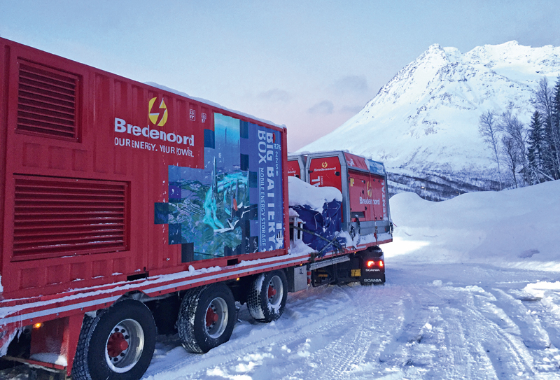 Norwegen gilt als eines der führenden Länder bei der Nutzung von Energiespeichern und Batterien. Beispielsweise verfügte bereits Anfang letzten Jahres die Hälfte der in Norwegen verkauften Autos über einen elektrischen Antrieb. Für den Bredenoord-Kunden war es daher ein Mehrwert, während des Tests nachhaltige Batterietechnologie einzusetzen. Der Anhänger und die Big Battery Box sind speziell für diesen Test für die Winterbedingungen mit arktischen Flüssigkeiten und Kraftstoffen ausgestattet, die mit Temperaturen von bis zu – 30 °C umgehen können. »Der Container der Big Battery Box ist so gut isoliert, dass die Anlage auch an wechselnden Standorten unter – 25 °C schnell aufgeladen werden kann«, betont Frank van den Hoek, Produkt-Manager bei Bredenoord.