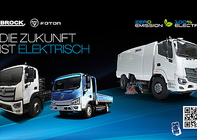 Bereits im Jahr 2016 wurde mit der Entwicklung einer vollelektrischen Großkehrmaschine begonnen, welche 2018 erstmalig auf einer Fachmesse in München voll funktionsfähig präsentiert wurde. Nach dieser Zeit hat sich die vollelektrische Kehrmaschine in einem Langzeittest in einer deutschen Großstadt bewiesen. Durch den Zusammenschluss mit Foton, einem der weltweiten Vorreiter für Elektroantriebe, war Brock in der Lage, die Technologie in der Elektromobilität so weiterzuentwickeln, dass inzwischen auch anspruchsvolle Anwendungen mit hoher Leistungskapazität zufriedenstellend abgedeckt werden können. Ein Quantensprung: Die Brock Kehrtechnik GmbH ist seit 2022 Generalimporteur für E-Chassis der Marke Foton in der 6-t-, 16-t- und 18-t-Klasse im deutschsprachigen Raum.