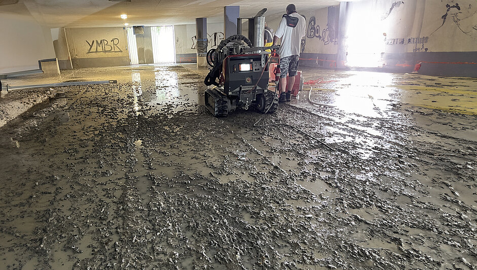 Der Aqua Cutter 410V ermöglichte nicht nur das einfache und präzise Entfernen von schadhaftem Beton, sondern auch das Freilegen von von Lochfraßkorrosion befallenen Betonstahlbewehrungen. So wurde bei dieser Parkhaussanierung schadhafter Beton unkompliziert und schnell abgetragen und parallel entsorgt. Stahlbewehrungen konnten erneuert und neuer Beton aufgespritzt und neu beschichtet werden. Alexander Arnold, Geschäftsführer der Saan Wasserstrahltechnik, zeigt sich begeistert von der Technologie: »Normalerweise hätten wir für dieses Projekt mit 370 m² abzutragendem Beton etwa 1,5 Wochen gebraucht. Mit dem Aqua Cutter haben wir das in nur drei Tagen geschafft. Das ist eine wirklich enorme Zeitersparnis. Außerdem ist das Arbeiten mit dem Aqua Cutter 410 V nicht nur effizienter, sondern eben auch angenehmer und darüber hinaus weit weniger belastend für unsere Mitarbeiter.«j