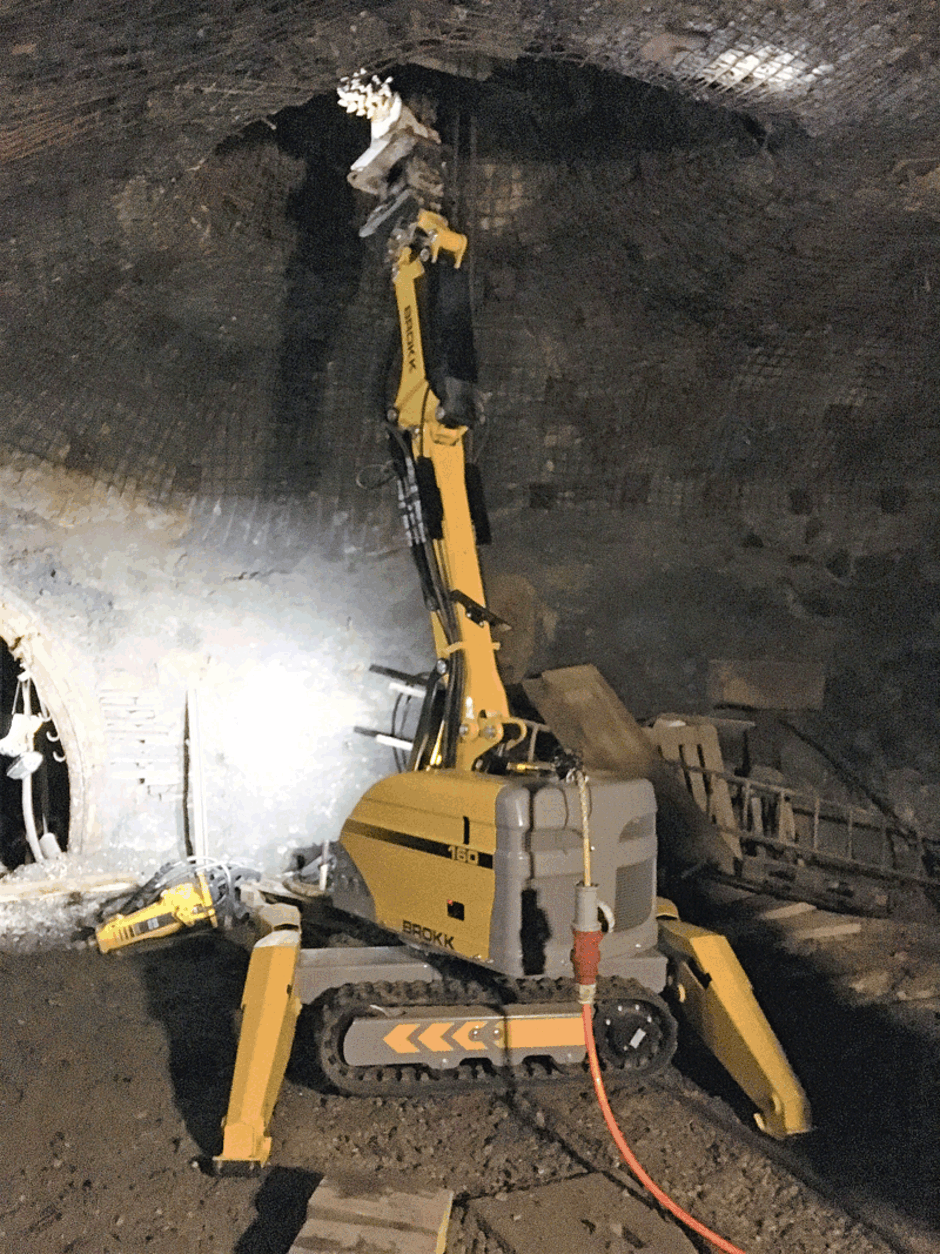 Der Brokk 160 löst mit angebauter Gesteinsfräse bzw. Hydraulikhammer die losen Gesteinsbrocken von den Wänden. Dabei steht der Maschinenbediener außerhalb des Gefahrenbereichs herunterfallender Felsbrocken, da er den Abbruchroboter mittels einer Fernbedienung aus sicherem Abstand genau fernsteuern kann.