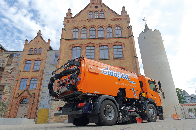Der Cleanox-Geschäftsführer Ralf Grimm wählte als Fahrgestell für sein neues Großkehrfahrzeug Bucher CityFant 6000 H bewusst einen Mercedes-Benz Atego mit Euro-VI-Motor. Diese Gesamtlösung umfasst einen einzigen Hauptmotor gemäß aktuell gültiger Abgasrichtlinie für sämtliche Verbraucher und bietet neben günstigem Kraftstoffverbrauch insbesondere den Vorteil, dass der thüringische Dienstleister bezüglich Emissionen für die Zukunft bestens aufgestellt ist: »Bisher stellen meine kommunalen Kunden noch nicht die strengeren Anforderungen«, erläutert Ralf Grimm, »aber das wird sich schon in absehbarer Zeit ändern. Mit meinem Euro-VI-konformen Großkehrfahrzeug erfülle ich bereits heute die Umweltauflagen von morgen.«