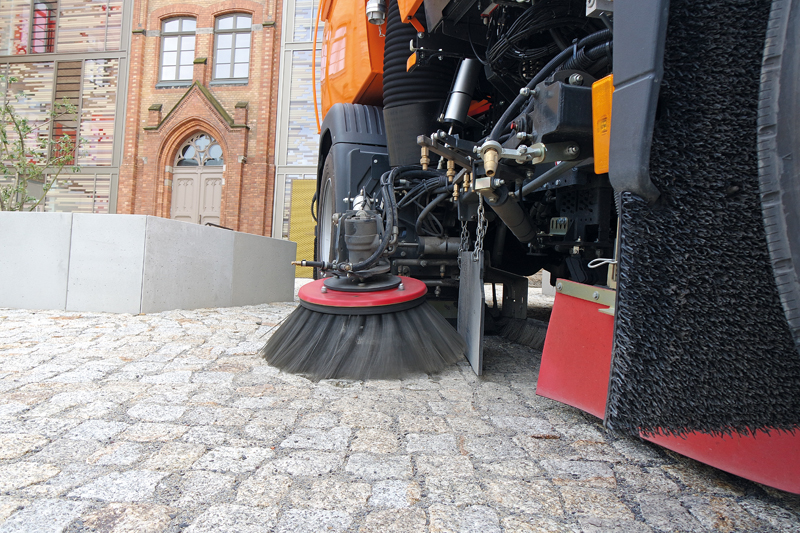 Ein wichtiges Technikdetail ist von außen nicht sichtbar: der hydrostatische Fahrantrieb. Er erhöht beträchtlich die Einsatzflexibilität des Fahrzeugs, das weitaus überwiegend zur Straßenreinigung verwendet wird, jedoch ebenfalls zum Reinigen von Sinkkästen sowie zum Reinigen von abgefrästen Verkehrsflächen in Kommunen. Grimm erklärt: »Im mechanischen Antriebsmodus können meine Fahrer ihre Transport- und Streckenfahrten schnell und kraftstoffeffizient ausführen. Im hydrostatischen Antriebsmodus dagegen können sie das Fahrtempo sehr gezielt einstellen und in extremer Langsamfahrt etwa schwierige, kurvige Straßenparcours bewältigen oder große Mengen an schwerem Fräsgut aufnehmen.« §