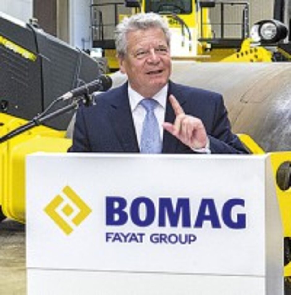 Gauck betonte in einer Ansprache die Bedeutung des Mittelstandes für Deutschland. Es seien gerade Unternehmen wie BOMAG, die zum Exporterfolg Deutschlands und zu dessen Fortbestand beitragen. »Daher freut mich die gleichzeitig nationale und internationale Ausrichtung Ihres Unternehmens ganz besonders«, so Gauck. Bei einer Führung entlang der Montagestraße für Walzenzüge begrüßte Gauck die Mitarbeiter der Spätschicht und informierte sich über die einzelnen Produktionsschritte.