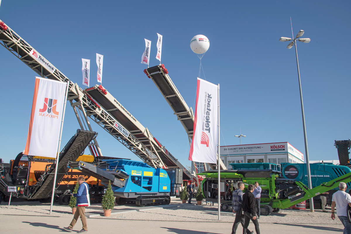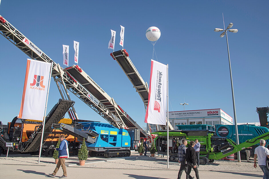Kölsch und Christophel, die Spezialisten für mobile Aufbereitungslösungen in der Gewinnung und im Recycling, das ist seit mehr als 30 Jahren ein eingespieltes Team, wenn es um die Präsentation von effizienten Lösungen geht. Im Freigelände Nord unterstrichen die beiden Handelsunternehmen – Kölsch hat seinen Sitz in Heimertingen (Unterallgäu), Christophel ist in Lübeck beheimatet – ihre Kompetenz in Sachen Brecher, Sieblösungen, Schredder, Klassieranlagen und Haldenbänder und zeigten Maschinen der Premiummarken Rubble Master Powerscreen, Portafill, Telestack, Franzoi, Pronar und CityEquip. t