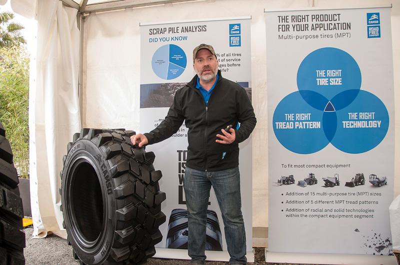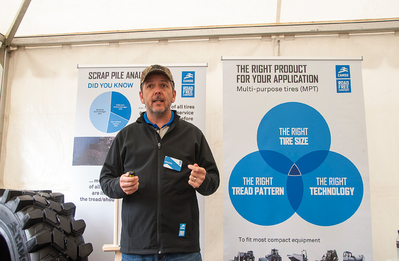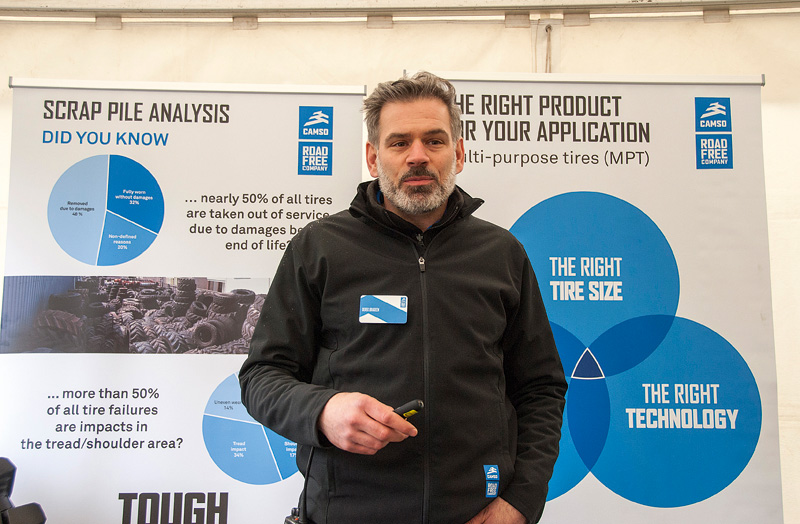 Dass im Off-Road-Sektor für einen Reifenhersteller »besondere Bedingungen« gelten, darauf verwies Derek Bradeen, Director Marketing Strategy and Communications bei Camso. »Ein Reifen muss exakt zum Einsatzgebiet passen«, sagte er. Diesem Umstand trage Camso Rechnung, indem man in vier spezialisierten Geschäftsbereichen mit Premiumprodukten bei Reifen sowie bei Gummilaufketten und Raupensystemen präsent sei: Materialumschlag, Bauindustrie, Agrarwirtschaft und Powersport (z. B. Motorschlitten und Quads).