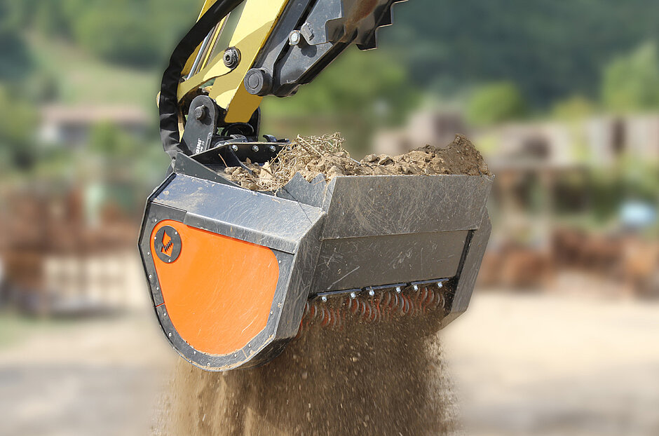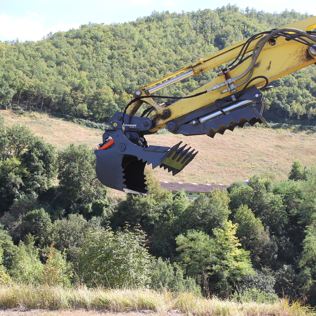 - Beidseitige Gabel, die das Risiko eines versehentlichen Herunterfallens des Geräts über den gesamten Hub bis zu einem Winkel von 30° zur Senkrechten des Grabarms verhindert. Ihre Form ermöglicht es, das Gerät erst dann zu lösen, wenn es in einer stabilen Position auf dem Boden steht.