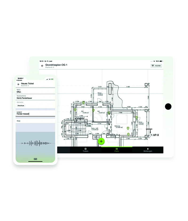 Vor Ort unterstützt die App die Abläufe auf der Baustelle umfassend, von der Koordination bis hin zur beweissicheren Dokumentation. Wenn Aufgaben an die Beteiligten verteilt werden sollen, kann der Bauleiter diese direkt in der App der jeweiligen Person zuweisen – so entstehen keine Missverständnisse. Auch beim Erfassen des Baufortschritts oder eventueller Mängel unterstützt die Software das Team: Mithilfe der Sprache-zu-Text-Funktion können Bemerkungen diktiert und als Text direkt auf dem Bauplan an der zugehörigen Stelle verortet werden; auch Fotos können in Capmo aufgenommen und abgespeichert werden. Baubehinderungen und Schäden sind damit sicher dokumentiert.