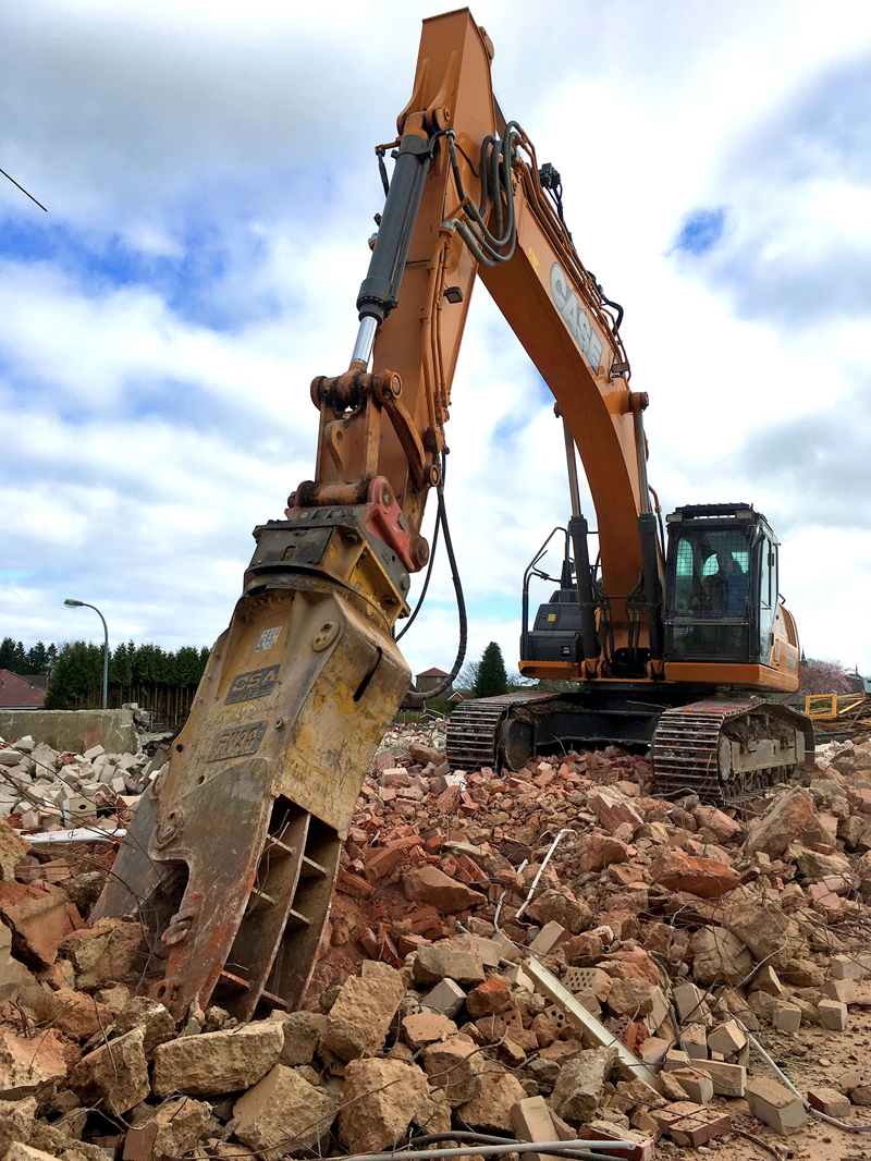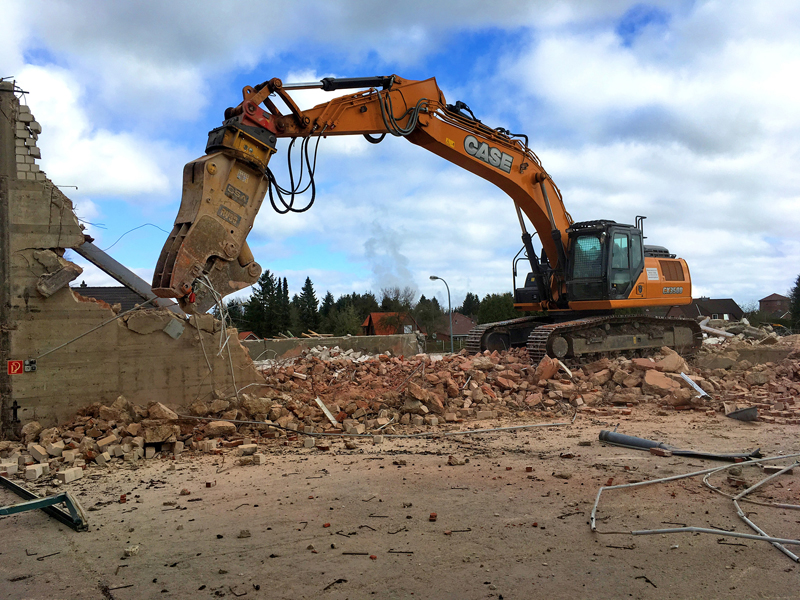 Für den Einsatz wurde das beste Arbeitspferd der Wibrek GmbH, ein 35,7 Tonnen schwerer CASE Raupenbagger CX350D mit einem drehbaren OSA Pulverisierer vom Typ RV30 ausgerüstet, den die NBM Böhrer GmbH und Co. KG in Kitzingen geliefert hat. Eine optimale Kombination aus Trägergerät und Hochleistungswerkzeug, wie Thomas Ihler feststellt. „Wir haben uns von NBM Böhrer bei der Auswahl beraten lassen und Sebastian Nolting hat uns den RV30 von OSA empfohlen. Der Anbau erfolgt über einen Lehnhof Schnellwechsler mit Adapterplatte. Wie sich schnell herausstellte, war das eine ausgezeichnete Wahl. Selbst beim Rückbau der bis zu 80 cm dicken Stahlbetonwände der Luftschutzbunker mit ihren zahlreichen Stahlarmierungen haben wir keinerlei Probleme gehabt, das Material zu zerkleinern und fachgerecht für die Weiterverwertung zu trennen und zu sortieren.“